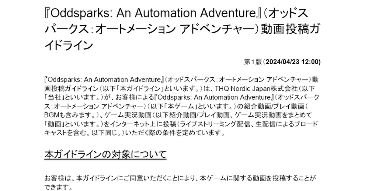 2024年4月23日にプレイ動画を投稿される際のガイドライン公開されています。申請を行う事で、サムネイルなどに使用する素材の提供を受けることも可能なようです。