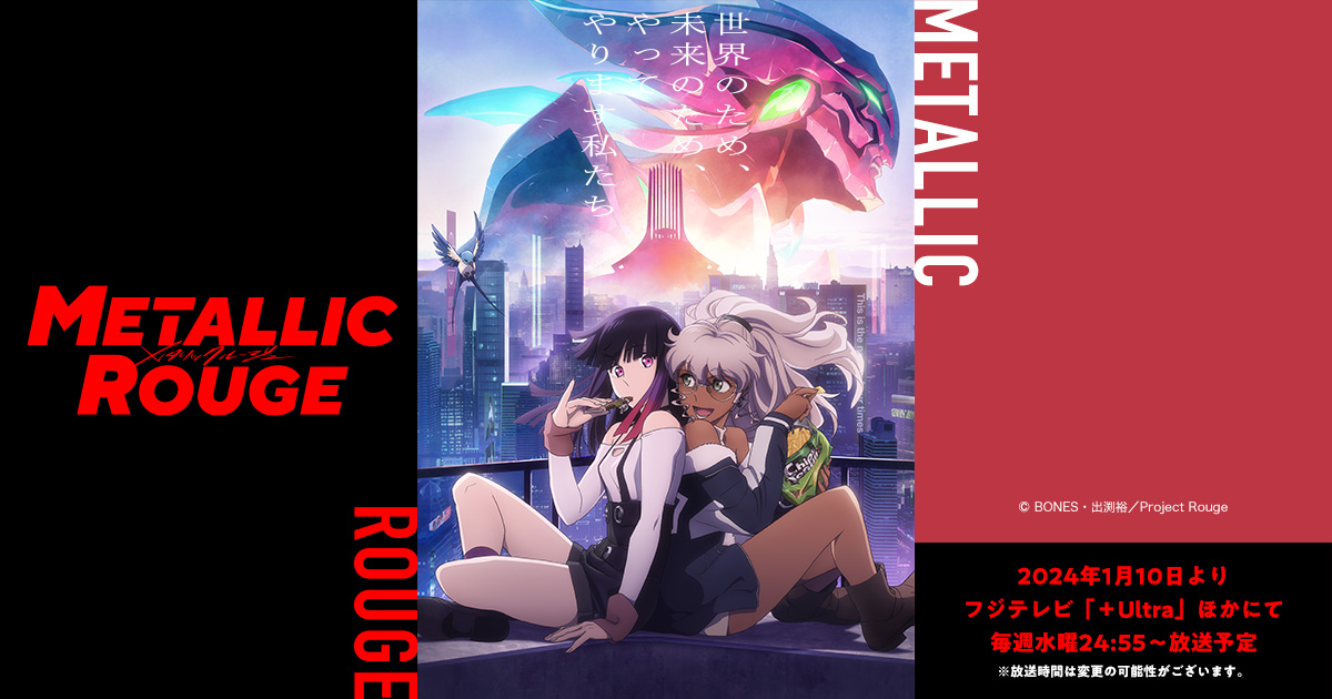 METALLIC ROUGE(メタリックルージュ)は、2024年1月10日(水)よりフジテレビ『+ULTRA』にて配信開始となる作品。『交響詩編エウレカセブン』などで知られるボンズと、出渕裕によるバトルアクション。人造人間たちが運命をかけて戦う、驚異のテック・ノワールSF作品。