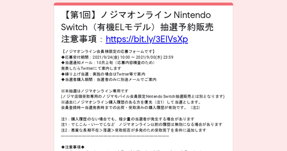 2021年10月8日(金)発売の『Nintendo Switch(有機ELモデル)』の際には、特設サイトを開設し9月26日(日)までの募集を実施。店頭での予約受付は行っていなかったようです。