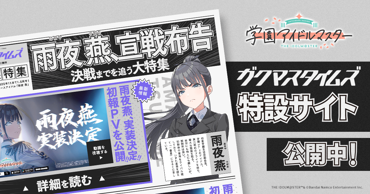 「学園アイドルマスター」は2025年11月で1.5周年!新たに実装予定の新プロデュースアイドル「雨夜 燕」の姿に迫る特設サイトです!