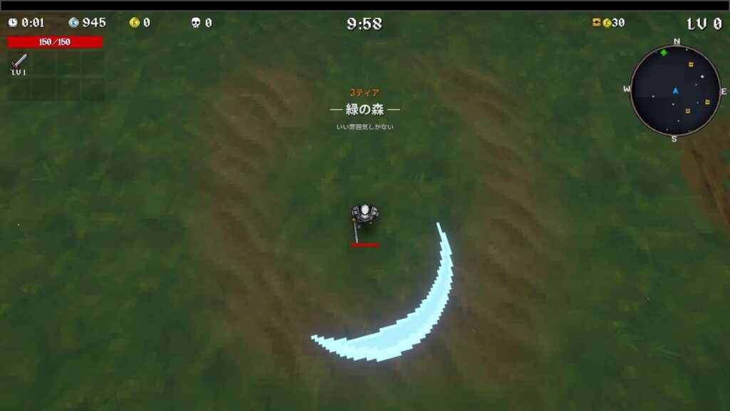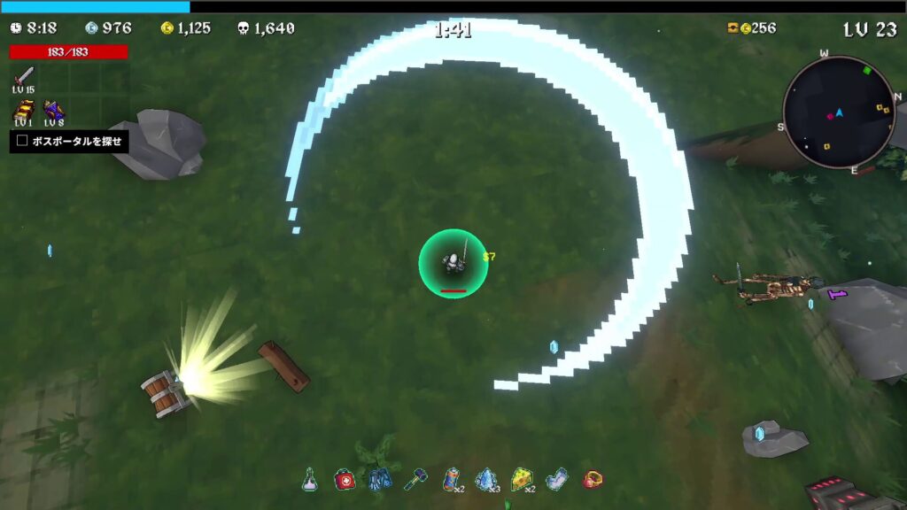 サイズを拡大していくと、自身を囲むような三日月形の斬撃に変わっていき、横方向もカバーできるように大きくなっていきます。サイズが小さいうちは、敵方向に向けての自動攻撃ではないためボスの対処は苦手ですが、サイズが大きくなると横方向にも伸びるためボスの周囲を回りながら攻撃を当てることも可能になっていくようです。