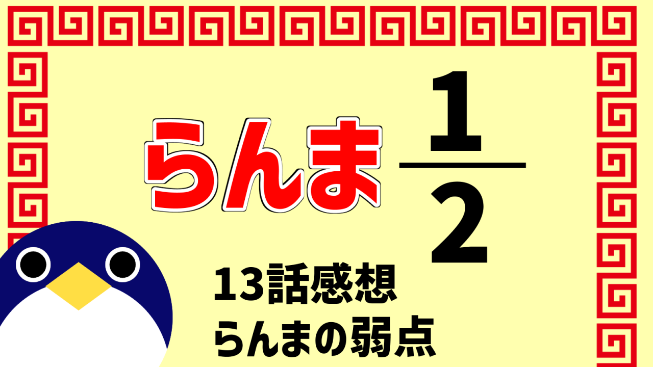 2025年秋に放送開始の作品、原作:高橋留美子、監督:宇田鋼之介によるらんま1/2の2期13話『らんまの弱点』 の感想文となります。旧作アニメ、原作のなどネタバレとなる要素も含みますので未試聴の方は注意してください。