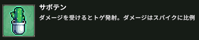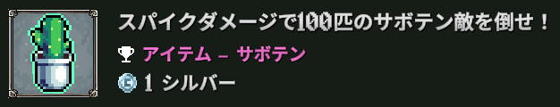 アイテム『サボテン』は、スパイクダメージで100匹のサボテン敵を倒せのクエストのクリアで入手が可能。
