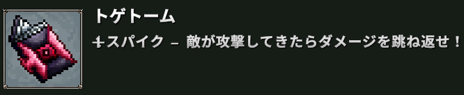 拾うトームはスパイク用の『トゲトーム』、スパイク時の自分のダメージを減らす『アーマートーム』と回避の『エヴェイジョントーム』、スパイク時のダメージ回復用の『リジェネトーム』。
