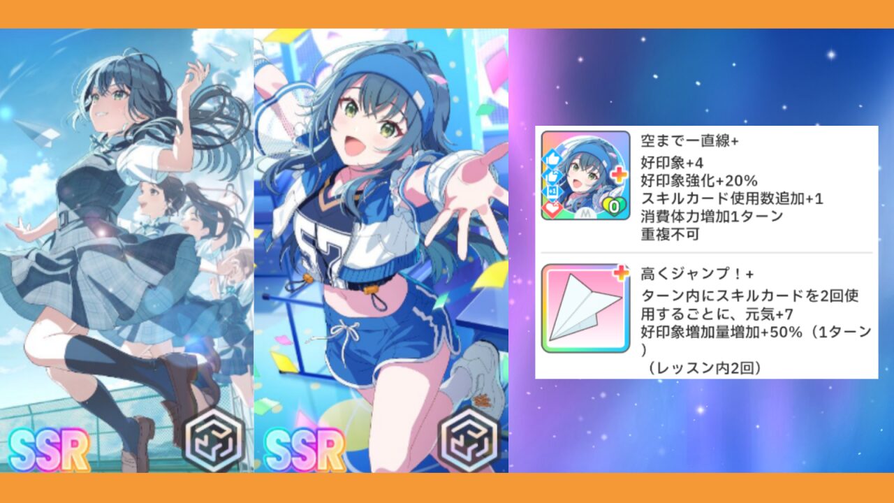 スキルカード『空まで一直線』は、好印象+4、好印象強化+20%に加え、スキルカード使用数追加+1の効果ですが、デメリットとして消費体力増加が1ターン付与されます。なお、付与される好印象強化の効果は、好印象によるパラメーターの上昇量を増やす効果、消費体力増加は体力の消費が2倍になる効果となっています。使い切りタイプのカードではなく、複数回利用可能となっているため、レッスン中に繰り返し使用可能となっています。