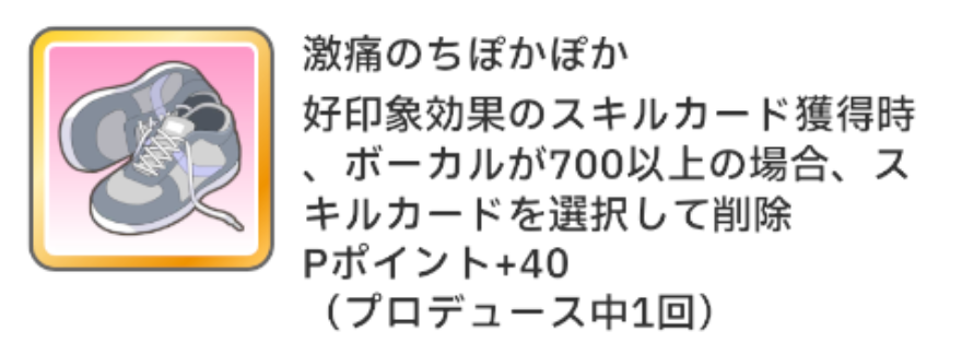 Pアイテム『高くジャンプ』は、ターン内にスキルカードを2回使用するごとに、元気+7、好印象増加量+50%(1ターン)がレッスン中2回発動。