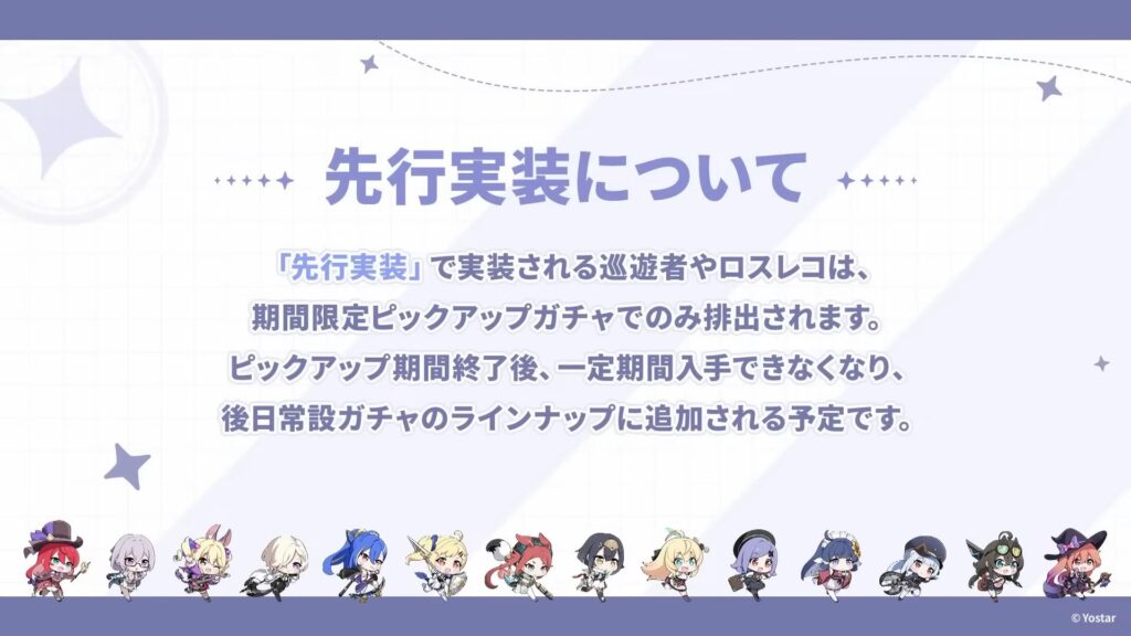 先行実装として実装される巡遊者やロスレコは、期間限定ピックアップガチャでの実装となり、ピックアップ期間終了後一定期間入手できなくなり、ただ、後日常設ガチャのラインナップに追加される形になるようです。