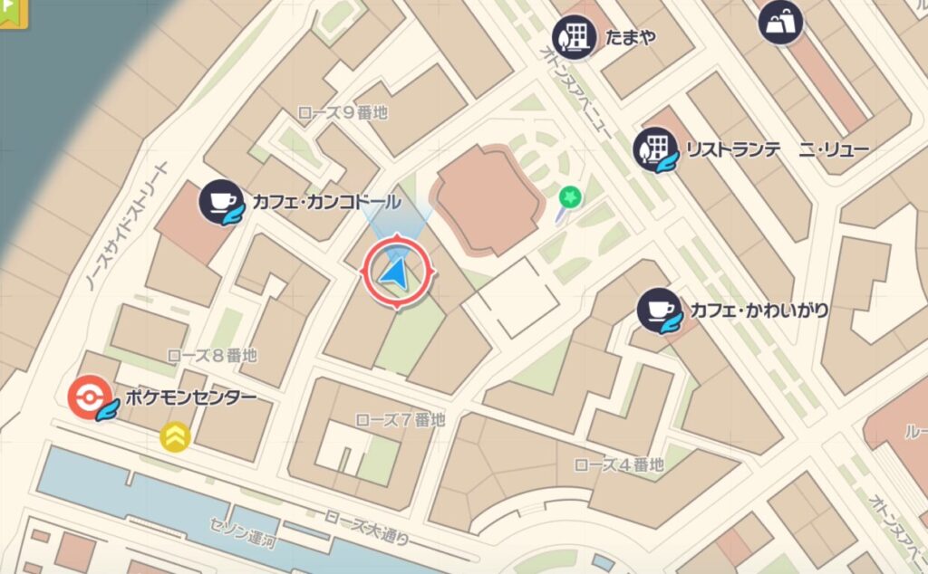 ローズ地区のポケモンセンターを川沿いに進み、以下の場所で左に曲がります。