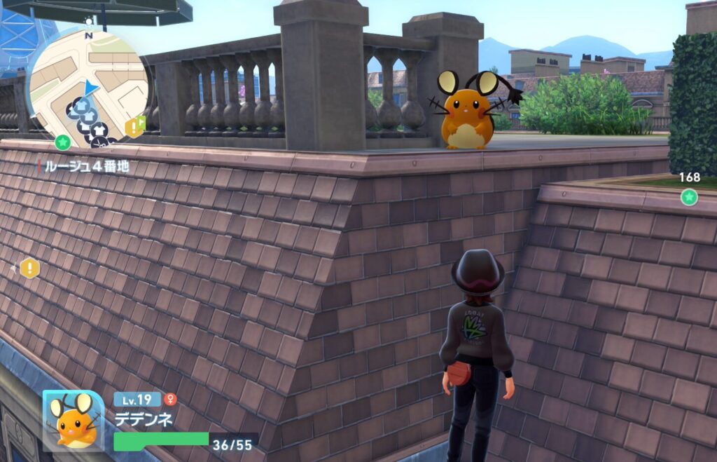 リオルがいるのは、屋根の上の南側角のあたりです。なお、屋根の上をリオルの方向に向かうと、中央辺りに高レベルのピジョットが一匹いるので避けて進む必要があります。