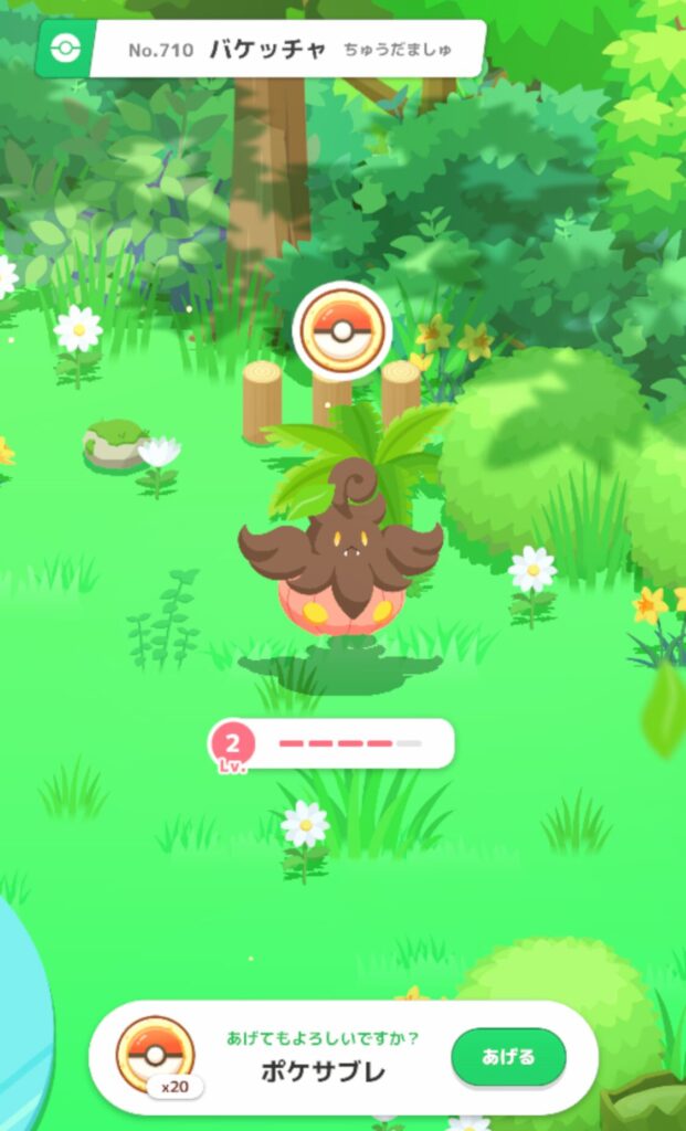 上記のように、サブレを与える画面に移行するとその時点でバケッチャの横にサイズにも一緒に表示されていることがわかります。パンプジンの方は、確認できていませんが、おそらく同様にサイズが表示するものと思われます。