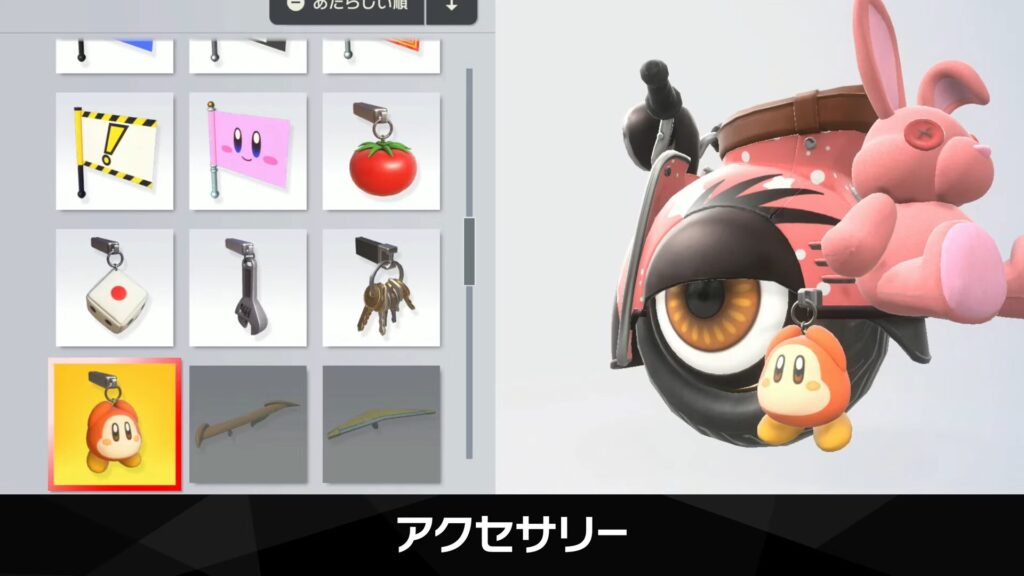 様々な旗、トマトやリンゴなどの果物、羽、ワドルディのキーホルダーや動物の尻尾などちょっとしたアクセントになるものに加え、ぬいぐるみやパラボラアンテナなどの一気に見た目の雰囲気が変わるもの、風車や提灯のような和風のものなど様々なものが用意されているようです。