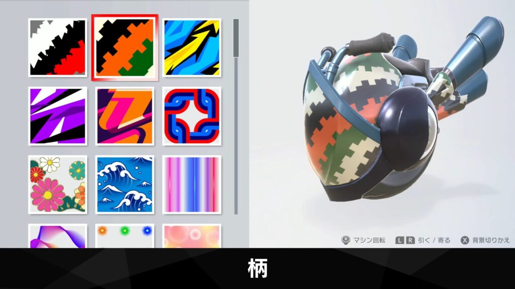 変更できる要素は、マシンのベースの色合いを変える『柄』、そこに模様を追加できる『デカール』、マシンに物を置ける『アクセサリー』、マシンから出るエフェクトを変更できる『エフェクト』といった項目があるようです。