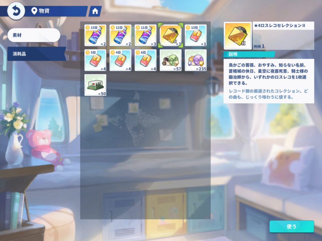 物資画面の消耗品の中に、ロスレココレクションや、巡遊者履歴書が保管されています。そちらを選択し使う事で対象の巡遊者・ロスレコからアイテムの入手が可能です。
