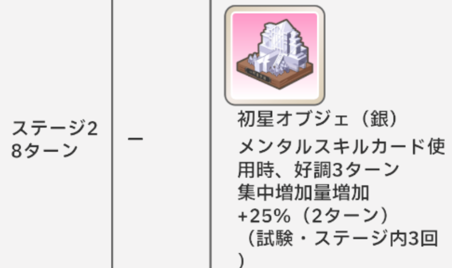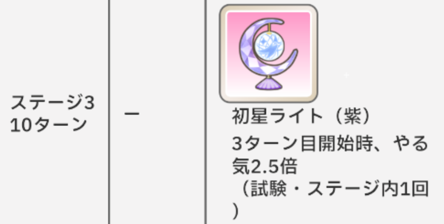 3ターン目開始時、やる気2.5倍の効果がステージ内1回発動。序盤にやる気を大きく稼げるかどうかがカギとなりそうです。
