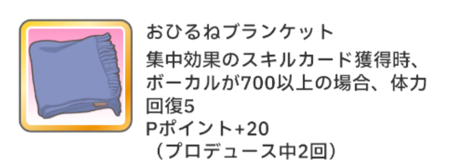 Pアイテム『水も滴る王子様+』は、アクティブスキルカード使用後、集中の50%分好調増加、集中+3の効果。なお、未強化の場合集中は+1となるようです。