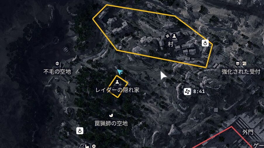 レイダーの隠し砦東側入り口を入ってすぐ左を向いたところ。ここから右に進むと2Fに上る梯子がある場所です。