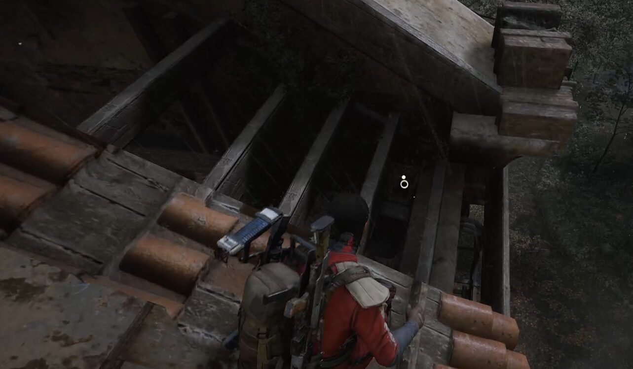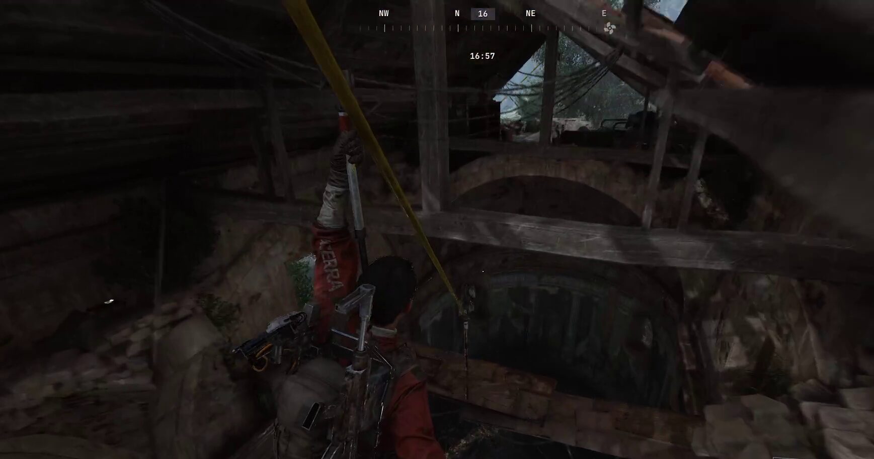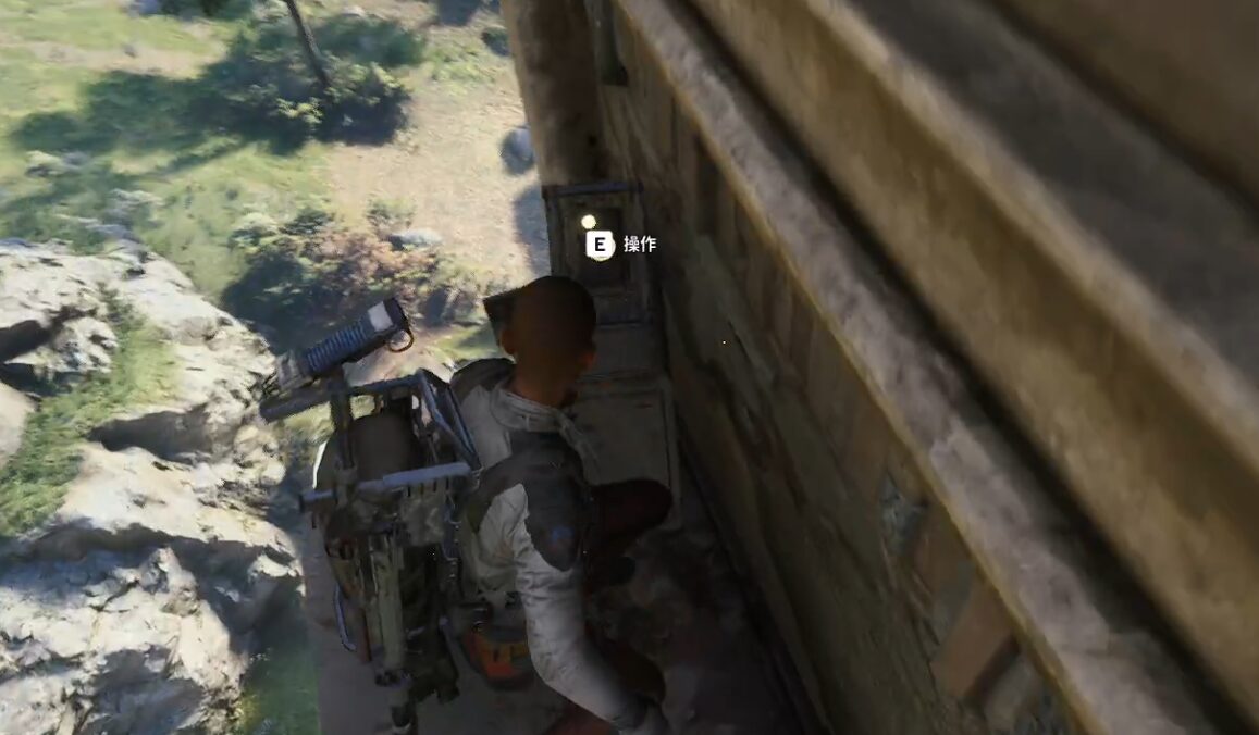 こちらは上り方がわからず確認はできていませんが、レイダーの隠れ家内部のジップラインを使って移動中に、上記画像の左端のあたりの白い部分、西側の壁の段差のようなところにボタンらしきものが見えました。