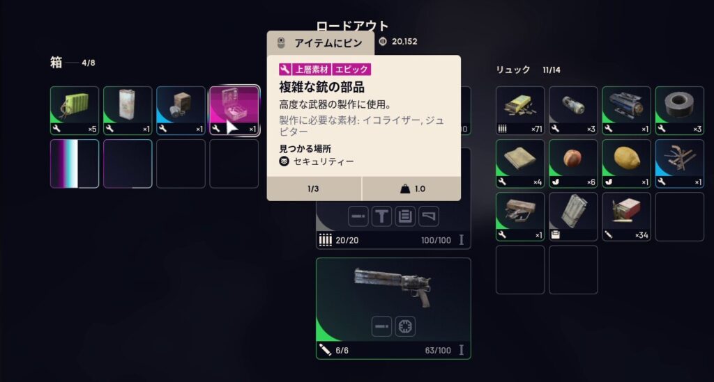 複数のアイテム回収スポットが用意されており、『複雑な銃の部品』などのエピック素材を確認しています。セキュリティのかかっているボックスもあるため、セキュリティ突破のスキルがあるとよさそうです。