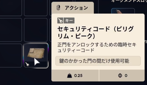 期間外に同じ個所を何度か探索してみましたが、出現しなかったため、鍵のかかった門の期間のみ入手可能となるようです。また、このアイテムは、持ち帰ることも可能なので、一度の期間中に扉に解錠に必要な4種類のコードを集めきる必要はなさそうです。