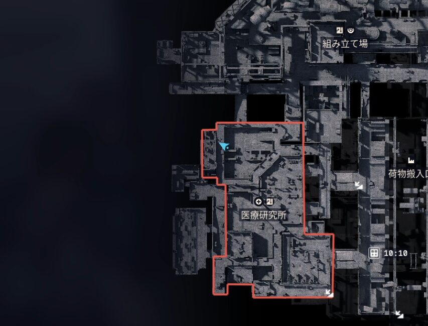 医療研究所までたどり着ければ、フロア内のわかりやすい位置にあるので扉を見つけるのは簡単です。ただ、プレイヤーの湧き地点に近く特に開始直後はプレイヤーが多い場所なので、他プレイヤーに注意が必要かもしれません。