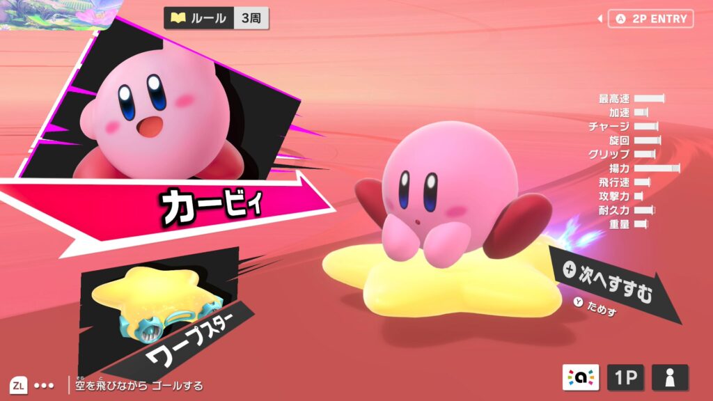 操作キャラはカービィを選択、ライドマシンも初期のワープスターを選びました。