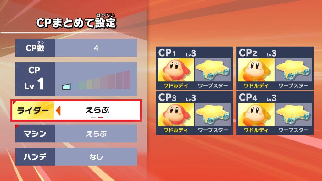 同時に走るCPの設定は、人数は4、全てのレーサーのCPLvを1、ライダーはワドルディ、マシンはワープスターを選択しました。ハンデについては、つけすぎるとあまりにも遅くなりすぎ、やりにくかったのでつけずに進めました。