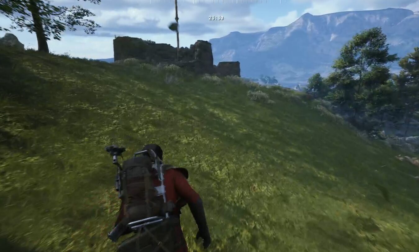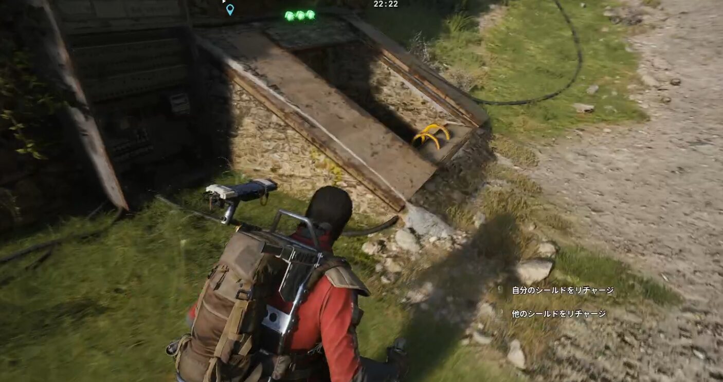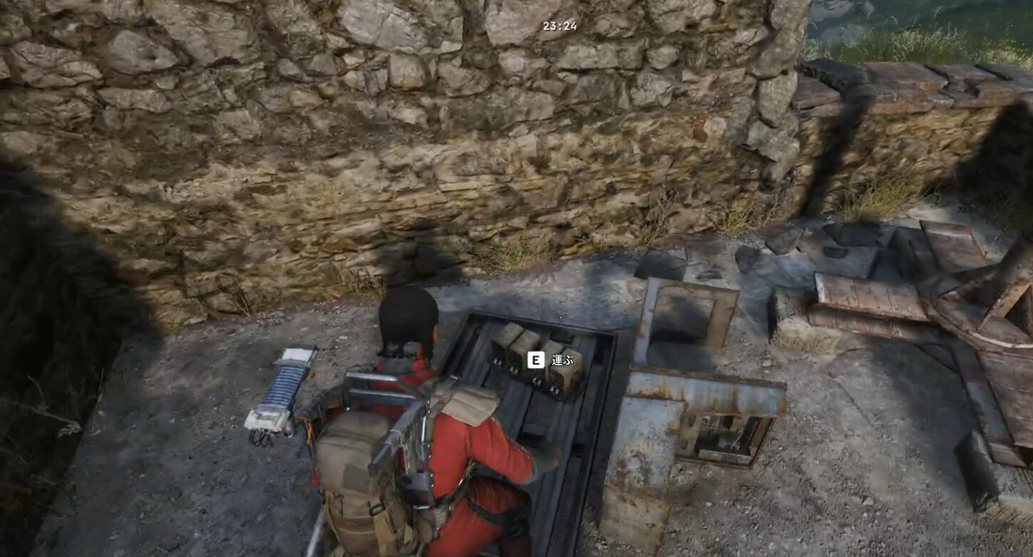 燃料電池の設置場所は、扉から黒いケーブルが伸びているのでそれを辿った先にあり、砦の外南側、西側から入り階段を昇った先、その奥の屋根がある空間の3か所にあり場所は固定となっています。ただ、設置する燃料電池は大昔の砦内部の他、周辺の廃墟に3つランダムで置かれているようで探して持ってくる必要があります。