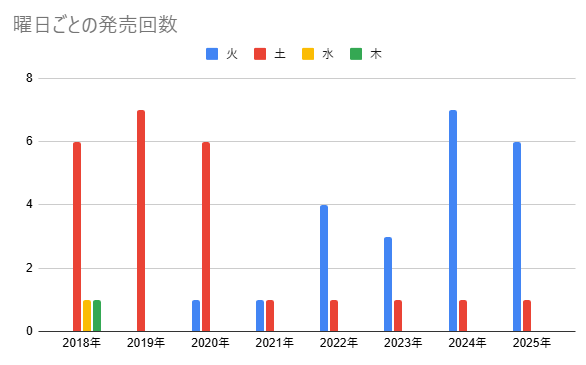 表のままだとわかりにくいので、それぞれの曜日の発売回数をグラフにしてみると次のような感じ。