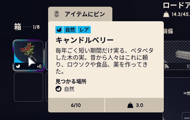 罠猟師の空き地の周辺は、結構広い範囲にキャンドルベリーが生えていることが確認できました。不毛の空き地とレイダーの隠れ家の間の森を、村側からぐるりと抜けていくことで、6か所ぐらいで採取することができ、合計10個ほどキャンドルベリーを拾っていくことができました。
