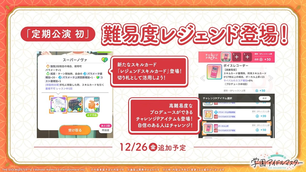 2025年12月20日に配信された学園アイドルマスターの情報番組『初星学園HR ~年末まったり3時間SP~』にて、以前の生放送で告知されていた定期公演初の新難易度レジェンドに関わる情報が公開されました。