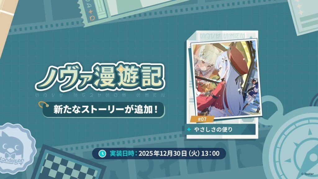 更にメインストーリーではありませんが、ノヴァ漫遊記の7章も12月30日に追加。やさしさの便りとのことで、クリスマス衣装も実装されたフリージアがメインのお話となるようです。