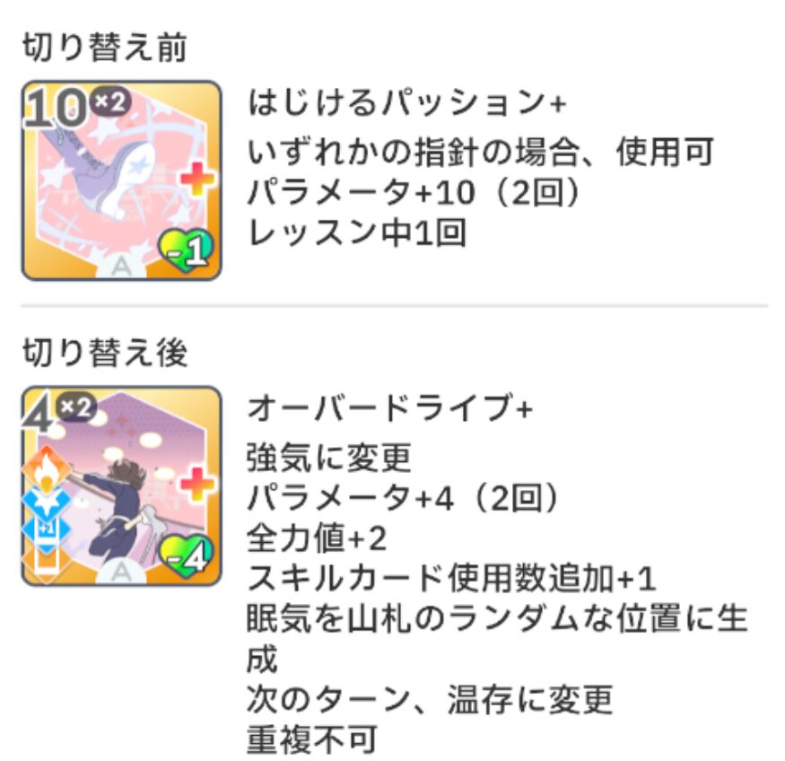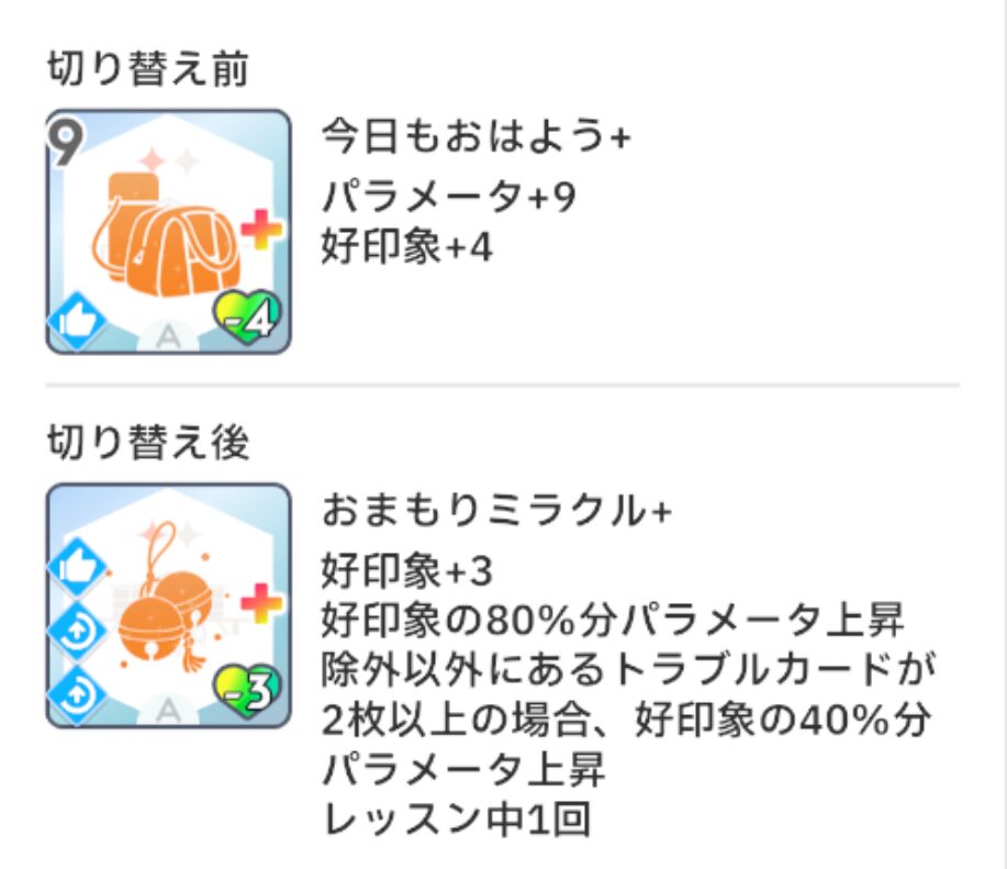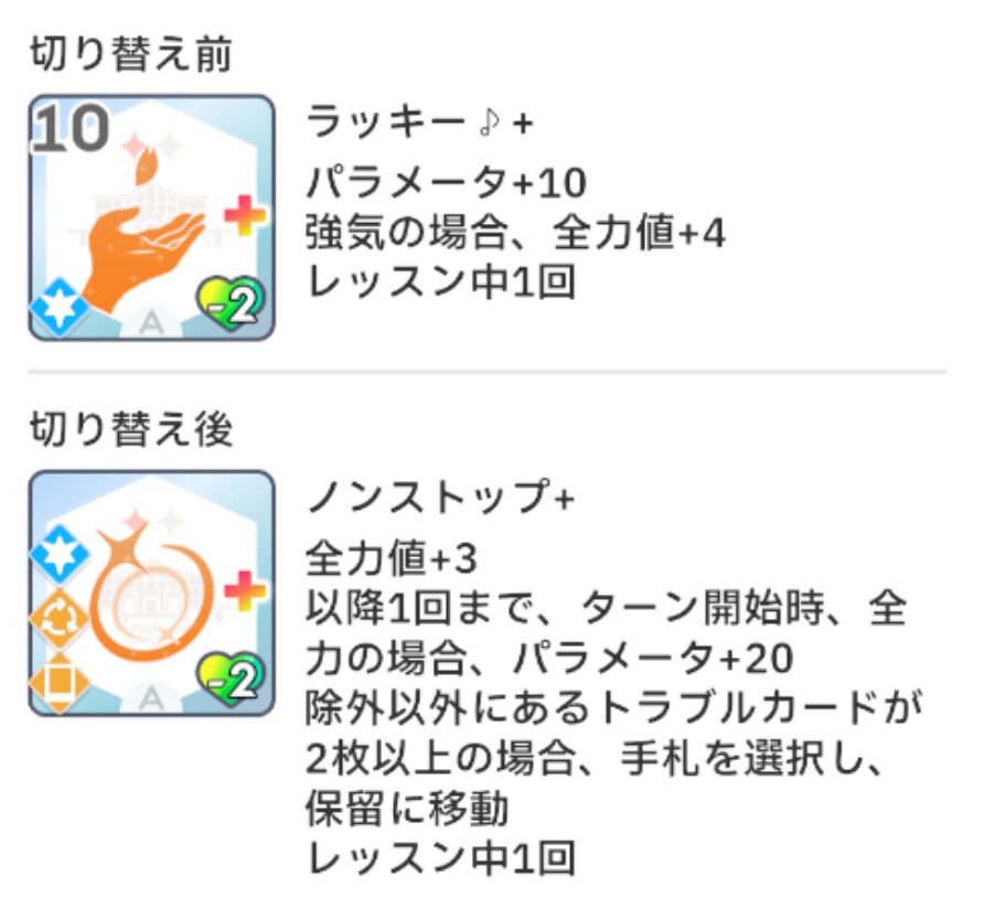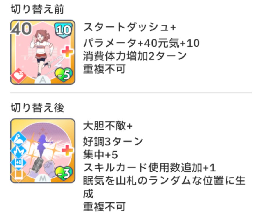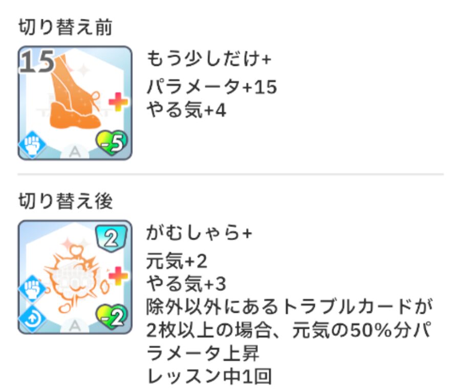 | 好調2ターン(70pt) | 集中+4(40pt) | 元気+9(70pt) |