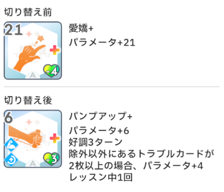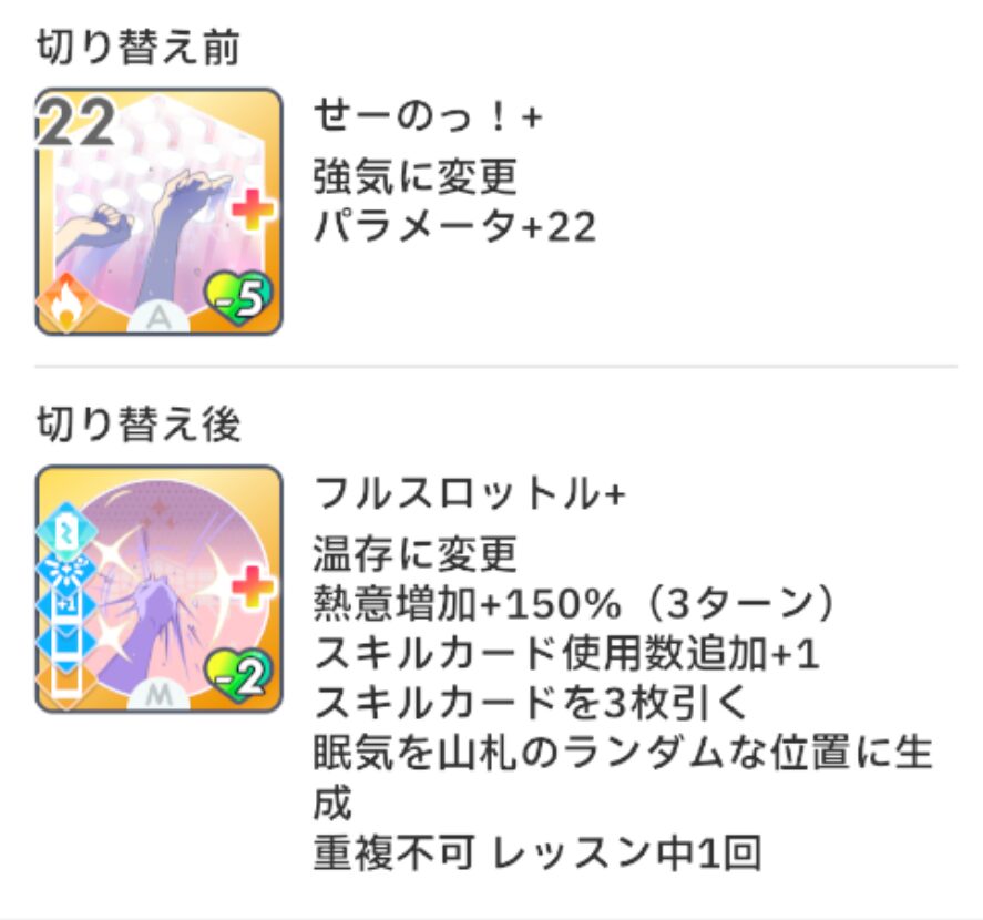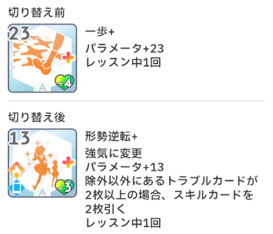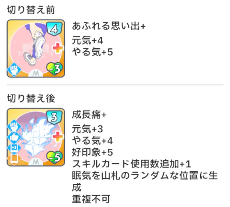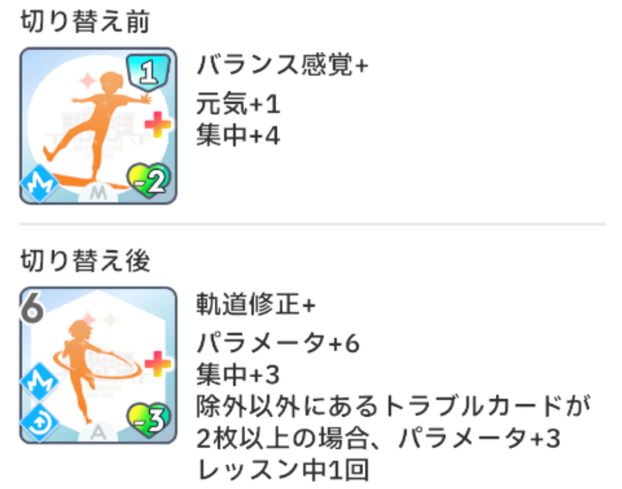 | 好調2ターン(70pt) | 集中+4(40pt) | 元気+9(70pt) |