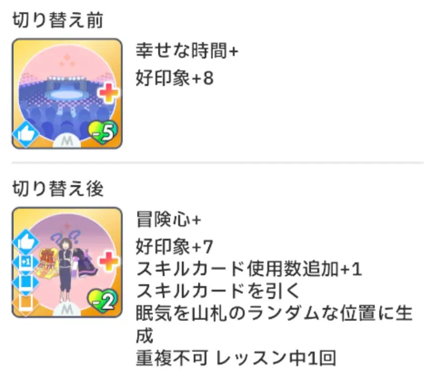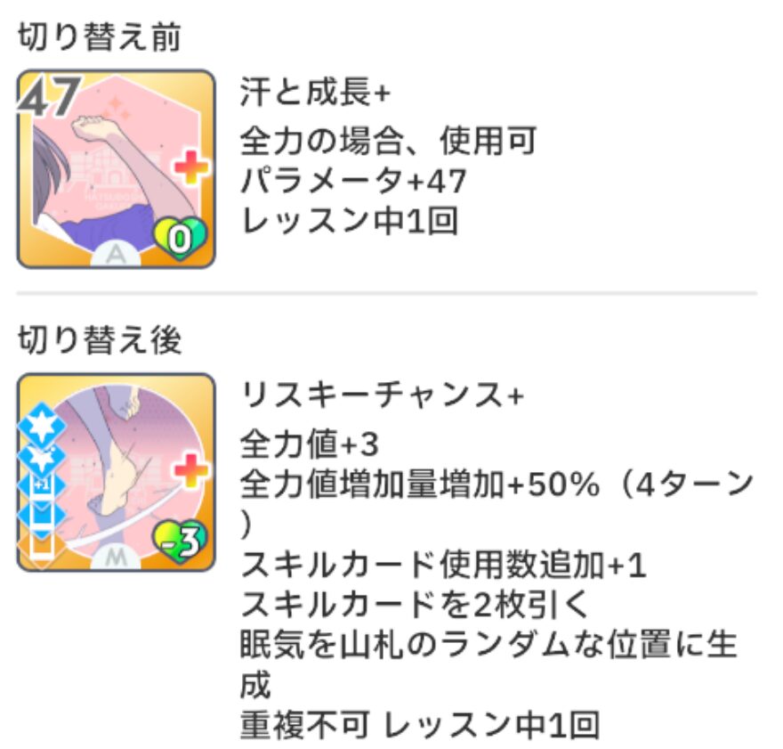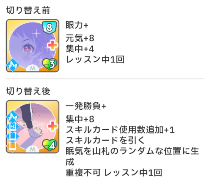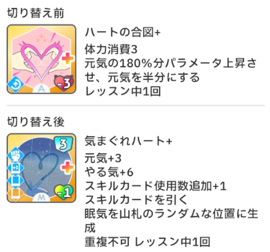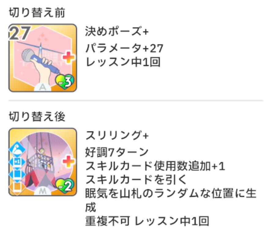 2025年12月26日に学園アイドルマスターにスキルカードスイッチ機能が新たに追加。Pレベル51以上で既存のスキルカードを、新たなスキルカードに切り替えられるようになりました。スキルカードスイッチの対象となるスキルカードはレベルが上がるごとに増えていくようです。