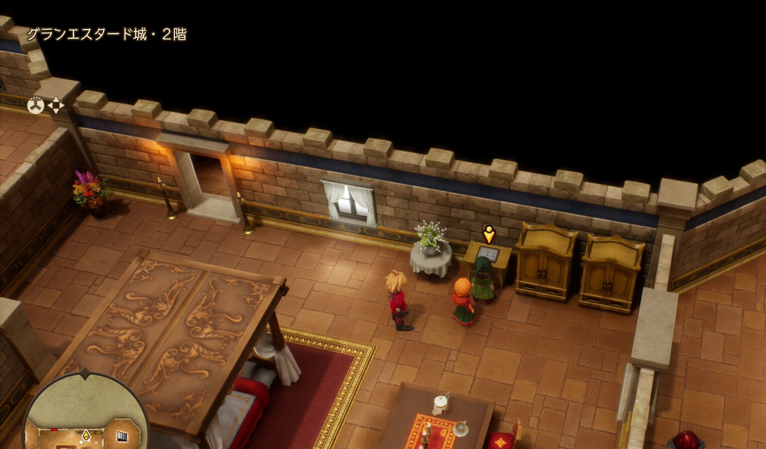 王様の部屋に入るには、一度城の屋上に出たうえでマップ右上の階段から城の中に入る必要があり、少し毛色がめんどくさいので注意が必要です。なお、部屋に入る際キーファがPTにいる必要はなく、城に入れるタイミングであれば、主人公一人でも入手が可能でした。