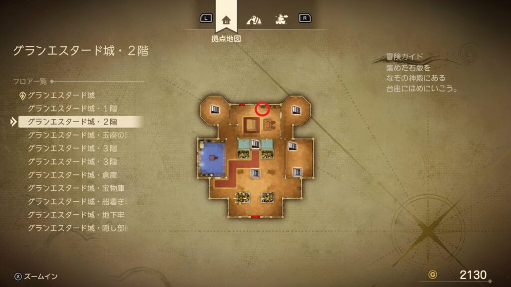 なお、最初にグランエスタード城についた時点では、この場所に行くことはできません。ある程度話を進めると、城の堀の水面を移動できるようになるのでそれ以降入手可能となります。