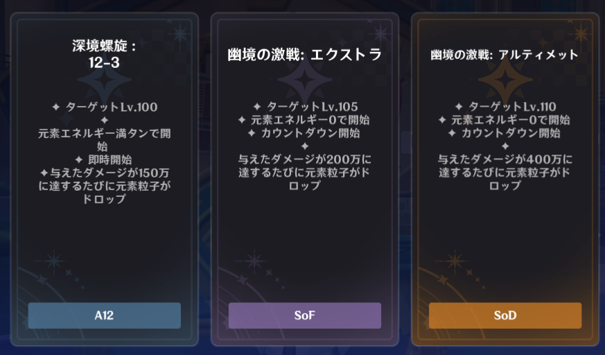 ここでは、深層螺旋12-3、幽境の激戦等のそれぞれの設定に合わせた設定を行う事が可能です。