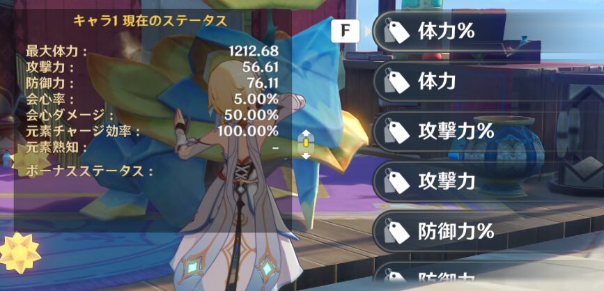 こちらのステータス調整は、聖遺物装備によるパラメーター上昇と同じように、実数・%で変更が可能。疑似的な聖遺物のシミュレーションも出来そうです。なお、元素熟知に関する項目は、星々の幻境の仕組みの関係で画面表示や変更ができないようです。