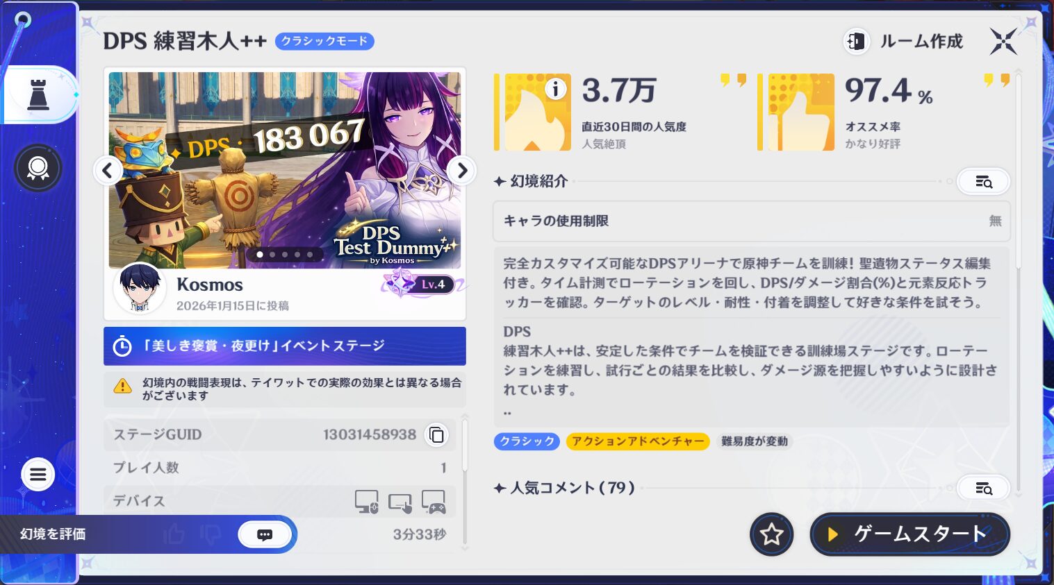 星々の幻境にて原神のPTを選択してDPSを測定できる『DPS 練習木人++』が公開されています。現時点ではアーリーアクセスとのことで、一部制限がありますがDPSの測定は可能なようなので使い方やできることを紹介します。