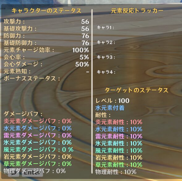 ターゲットとなる敵、属性への耐性、元素付着の状態、キャラクターのバフなど様々なセッティングが可能。