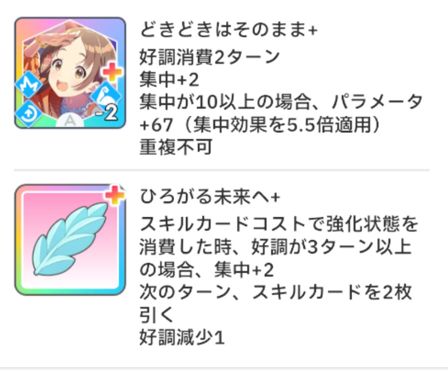 スキルカード『どきどきはそのまま+』は、好調消費2ターン、集中+2、集中が10以上の場合、パラメータ+67(集中効果を5.5倍適用)。