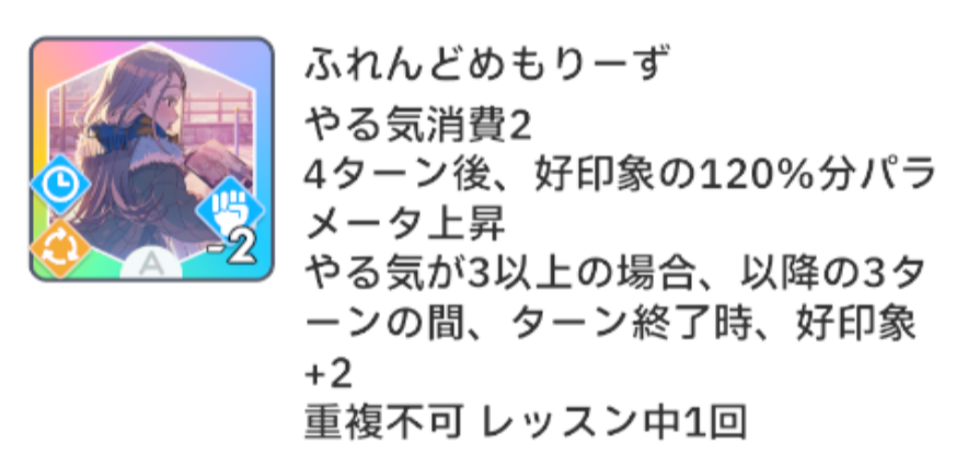 こちらも、スキルカードコストで強化状態を消費した際に発動する効果を持っており、最初のターン強制的に減らされた体力を、Pアイテムのスキルカードコストで強化状態を消費した際の効果で回復していく、というかなり特殊な効果を持ったアイドルとなるようです。