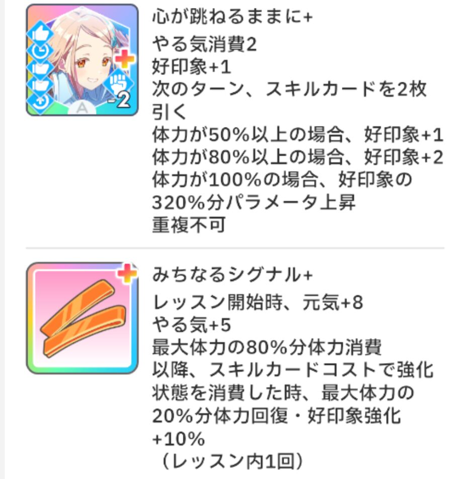 69スキルカード『心が跳ねるままに+』は、やる気消費2、好印象+1、次のターン、スキルカード2枚引く、体力が50%以上の場合、好印象+1、体力が80%以上の場合、好印象+2、体力が100%の場合、好印象の320%分のパラメーター上昇効果。