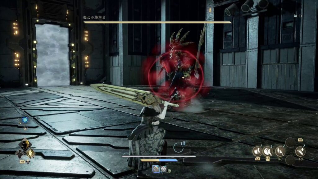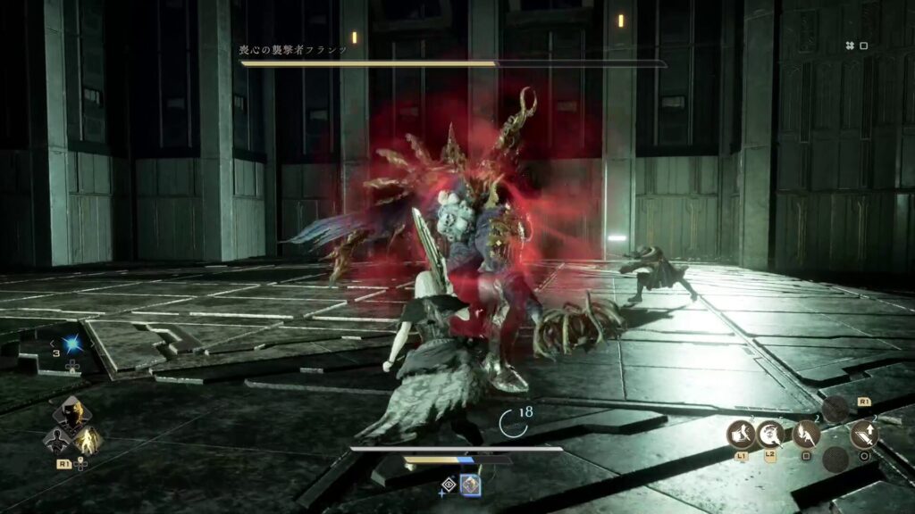 受け流し(パリィ)を狙うのは、上図の赤いオーラを纏ったあとに突進してくる攻撃。上の画像ぐらいの距離をとっていると、オーラを纏った瞬間に受け流し(パリィ)を発動するとちょうどタイミングが取れました。この攻撃は、第二形態でも使ってくるので、そちらもで積極的に受け流し(パリィ)を狙っていきます。