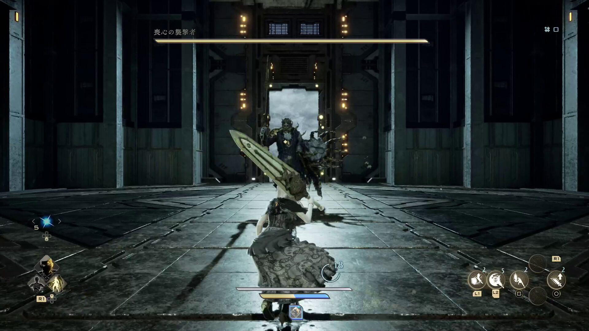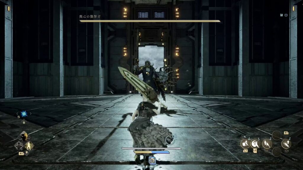 第一形態の喪心の襲撃者は、銃剣を構えた戦闘スタイル。一番痛いのは、近接の連続攻撃なので距離を取り後ろに下がりながら戦う事で回避しやすい位置を取りつつ、受け流し(パリィ)のしやすい突進攻撃を狙いました。受け流し(パリィ)後の隙に、2回ほど大剣でダメージを与え、後ろ回避で再び距離を取り再び受け流し(パリィ)を狙うといった戦い方をしました。
