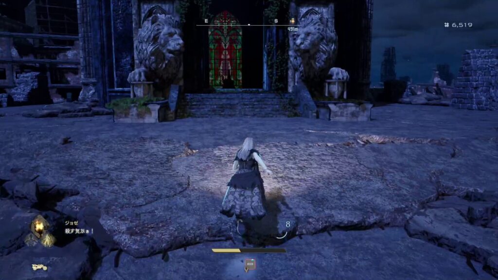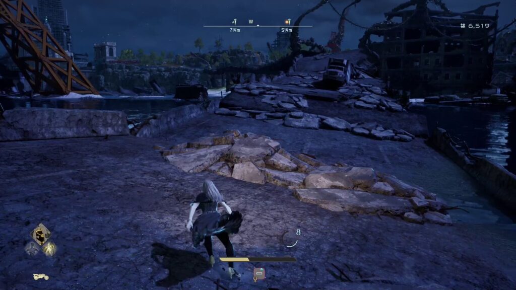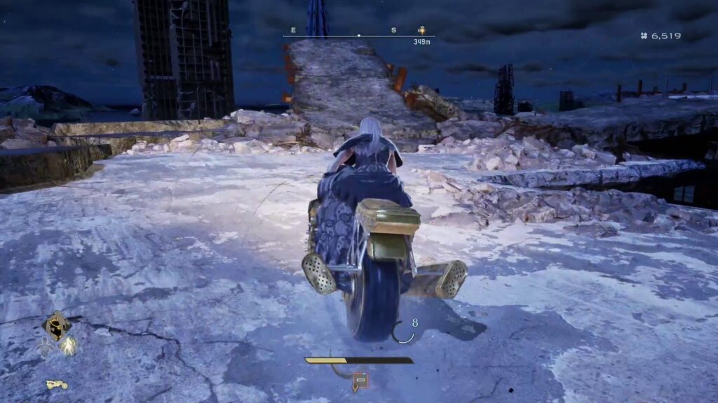 屋上には、如何にもジャンプ台にしてくれといった感じの瓦礫が再生の塔方面に伸びているので、バイクでこれを足場にして飛びます。なお、バイクでの飛行は、バイクで空中にいる際に×ボタン(PS5)を押すことで可能です。思ったより距離がギリギリで、途中で落ちるとそのまま死亡となるので注意が必要です。