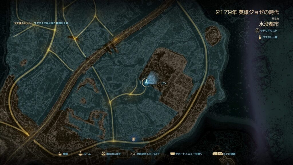 帰り道はファストトラベルを利用してもよいですが、そばの壊れた高速道路の上を辿っていくことで、陸地の方に戻ることもできます。高速道路の上にはアイテムも置いてあるので、一度歩いて戻ったほうが良さそうです。