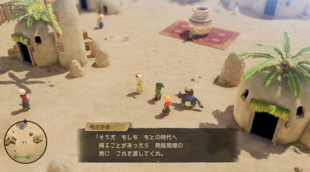 過去の砂漠のシナリオをクリア後に、砂漠の村にいる考古学者から『お金と手紙』を受け取り、男に渡すことで中に入れるようになります。