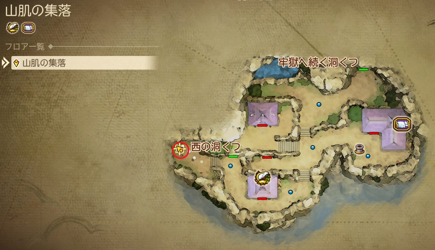 過去の山肌の集落にあるちいさなメダルは、山肌の集落のマップ左端のツボに入っています。なお、山肌の集落は、ダーマ神殿、西の洞くつから牢獄へ続く洞くつの途中にあるマップとなっています。