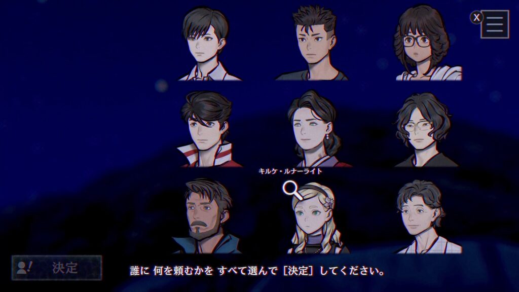 ここでの解答は、9人の登場人物、それぞれの3つの選択肢から誰に何を頼むかを選択する必要があり、総当たり的な試し方では達成するのが難しい問題となっています。